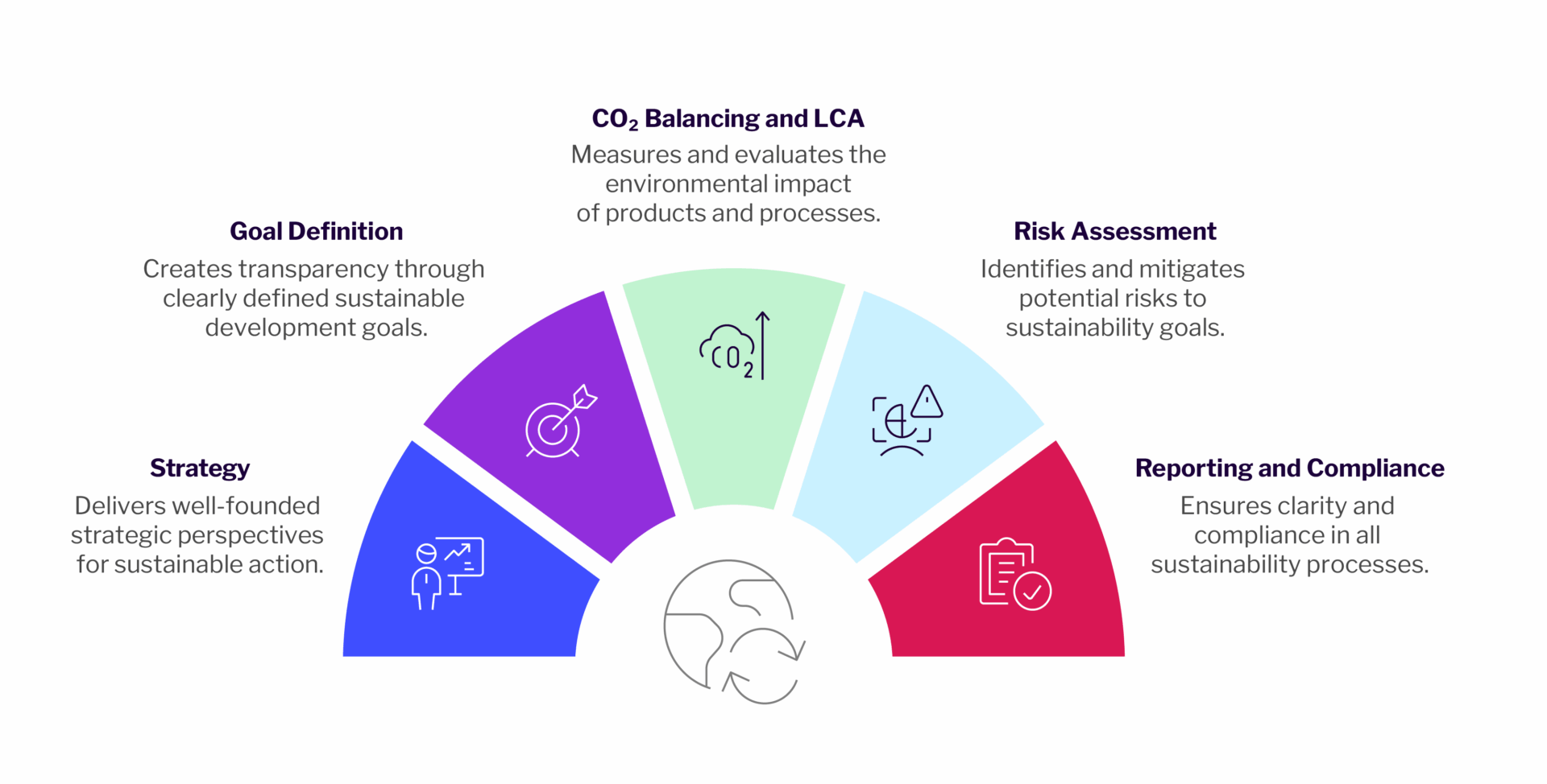 With our extensive expertise in sustainability management, we support you in optimizing your sustainability approach and develop tailor-made solutions that have an impact – comprehensible, effective and resource-saving.